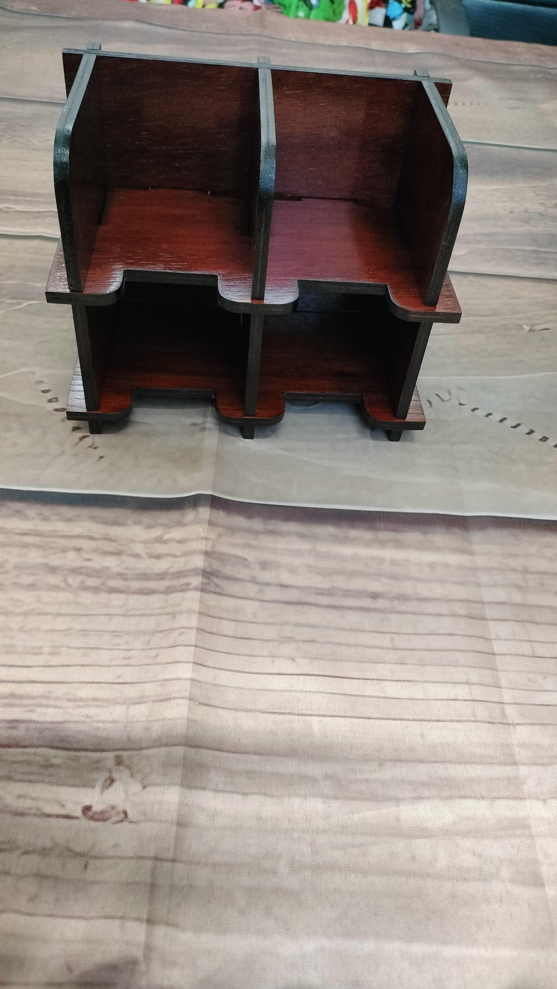 These are made from 6mm ply board, stained in a Jarrah colour and coated with a minimum of 3 coats of gloss varnish for protection. They are perfect to help control that card clutter on the table.